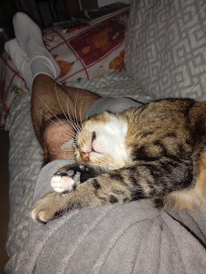 Pluton adore se mettre sur les jambes lorsque je regarde la télévision, un grand moment où les chats savourent le bonheur de la sécurité, de l'osmose avec leurs propriétaires, la chaleur du foyer et le temps qui décante à l'aune d'une horloge qui s'immobilise...